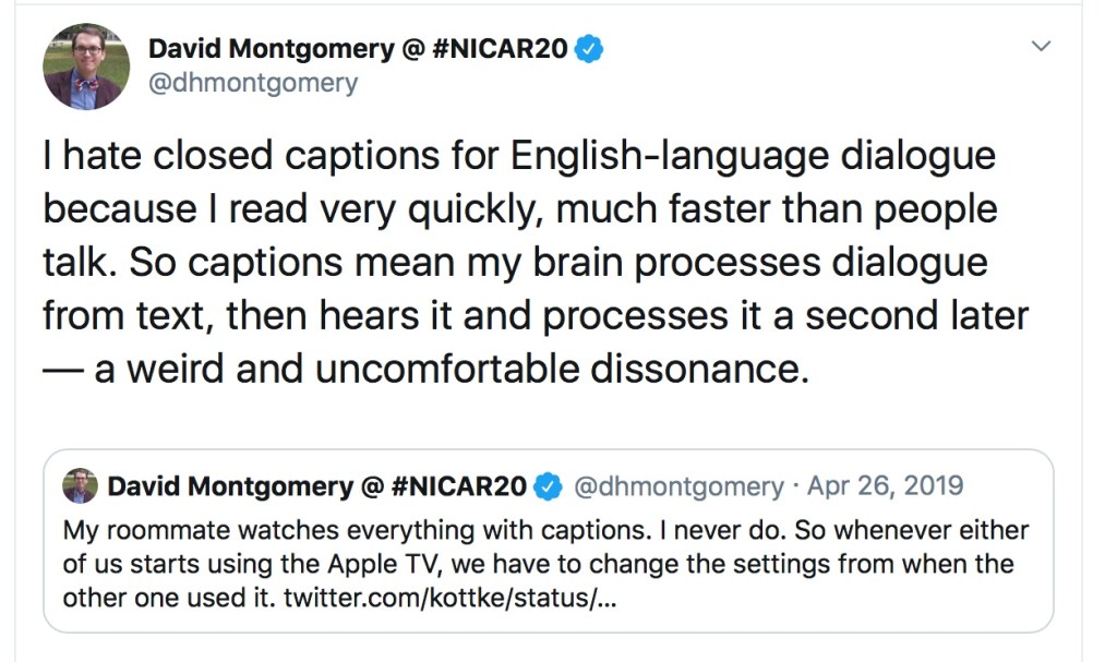 I have compiled a few examples from my Twitter timeline of various users complaining about the use of closed captions: