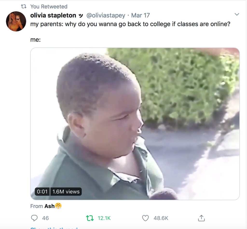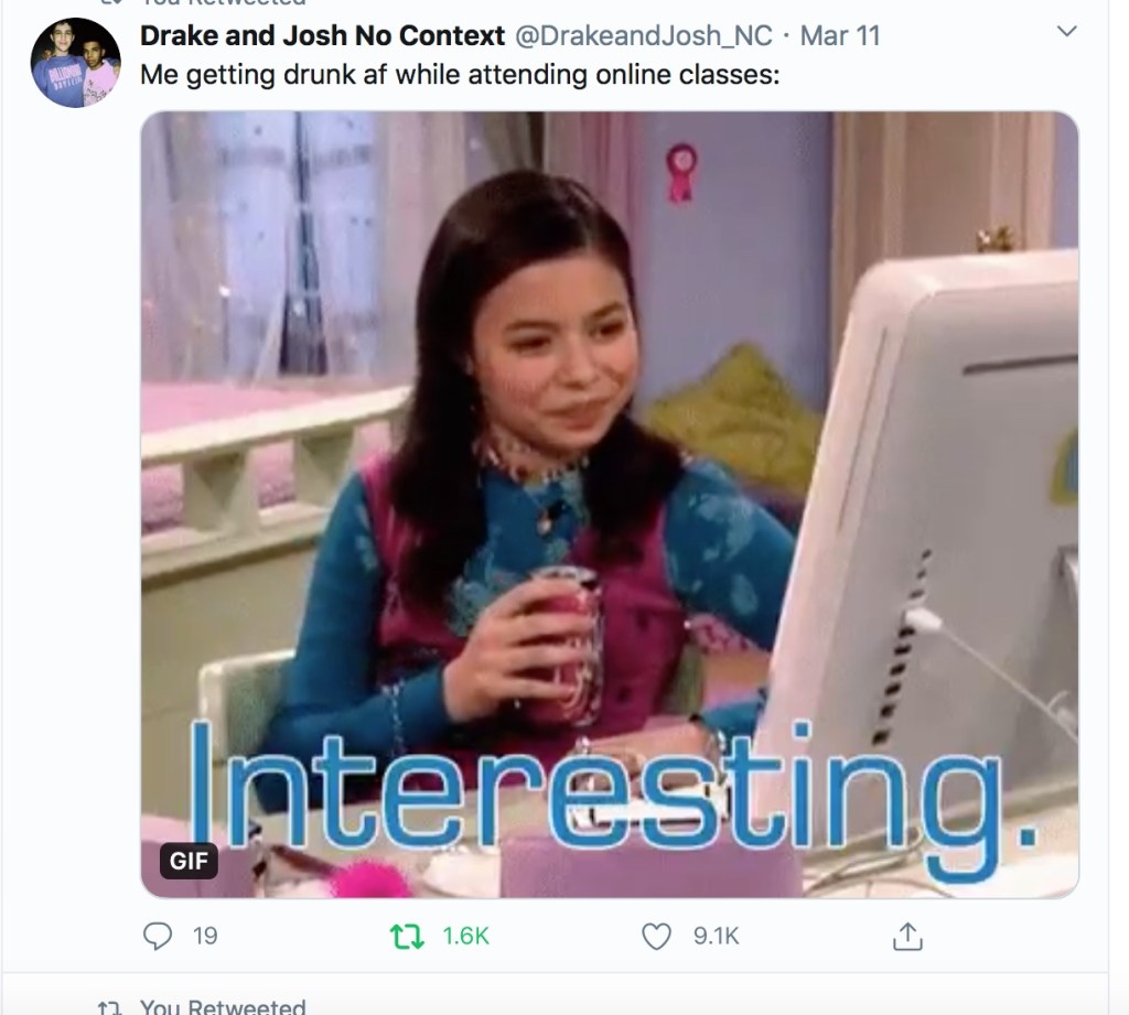 This video of the little boy saying he “just wants to do hood rat shit with his friends” has resurfaced and been remixed to be relatable for college students stuck at home.Much like the above video, this meme from Drake & Josh has been given a new caption related to online classes and quarantine.This meme from Zootopia has been remixed to relate to the virus and the boredom everyone feels while being stuck in the house.